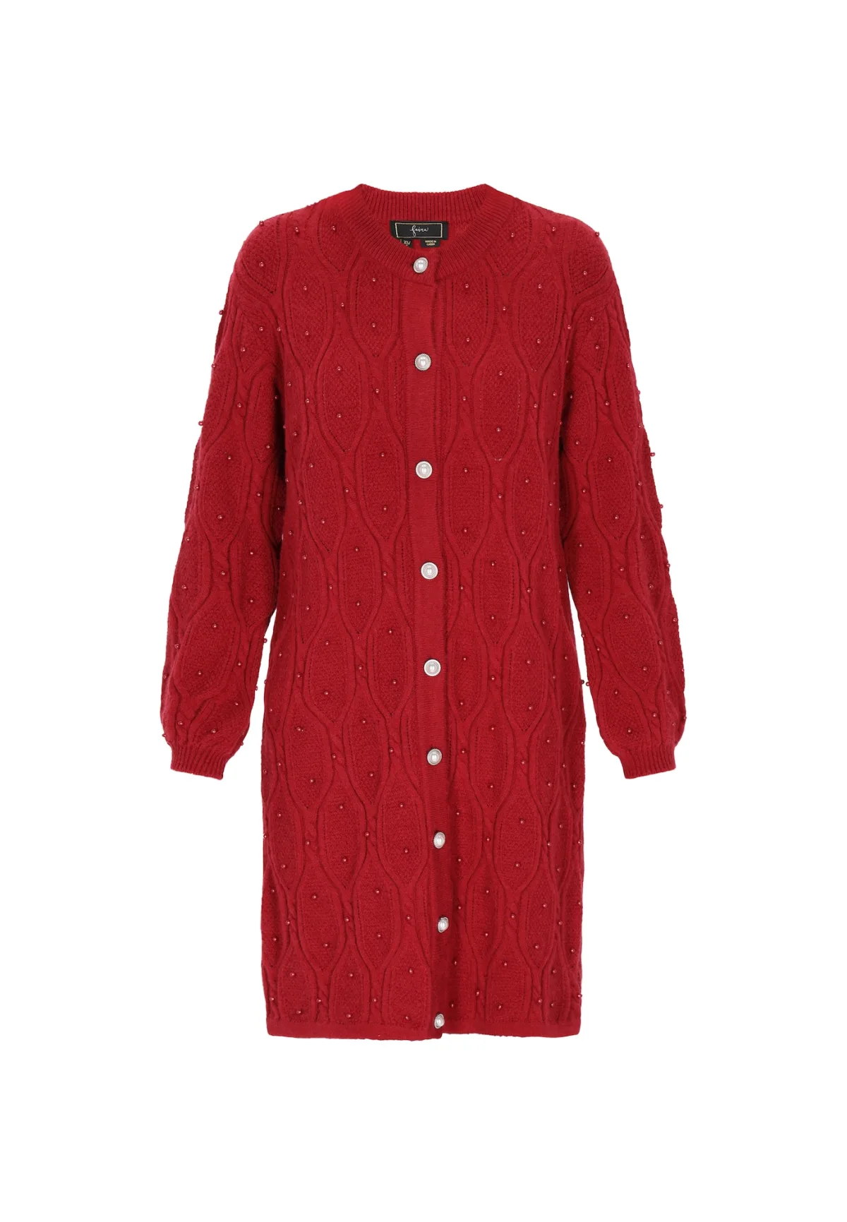 Design: Geribbelde kraag, Knop placket, Geribd ceintuurtje; Type sluiting: Knoopsluiting; Materiaal: Knitwear; Halstype: Ronde hals; Motief: Effen; Details: Parels; Extra's: Applicaties; Pasvorm: Wijde pasvorm; Armlengte: Lange mouw; Lengte: Lange pasvorm