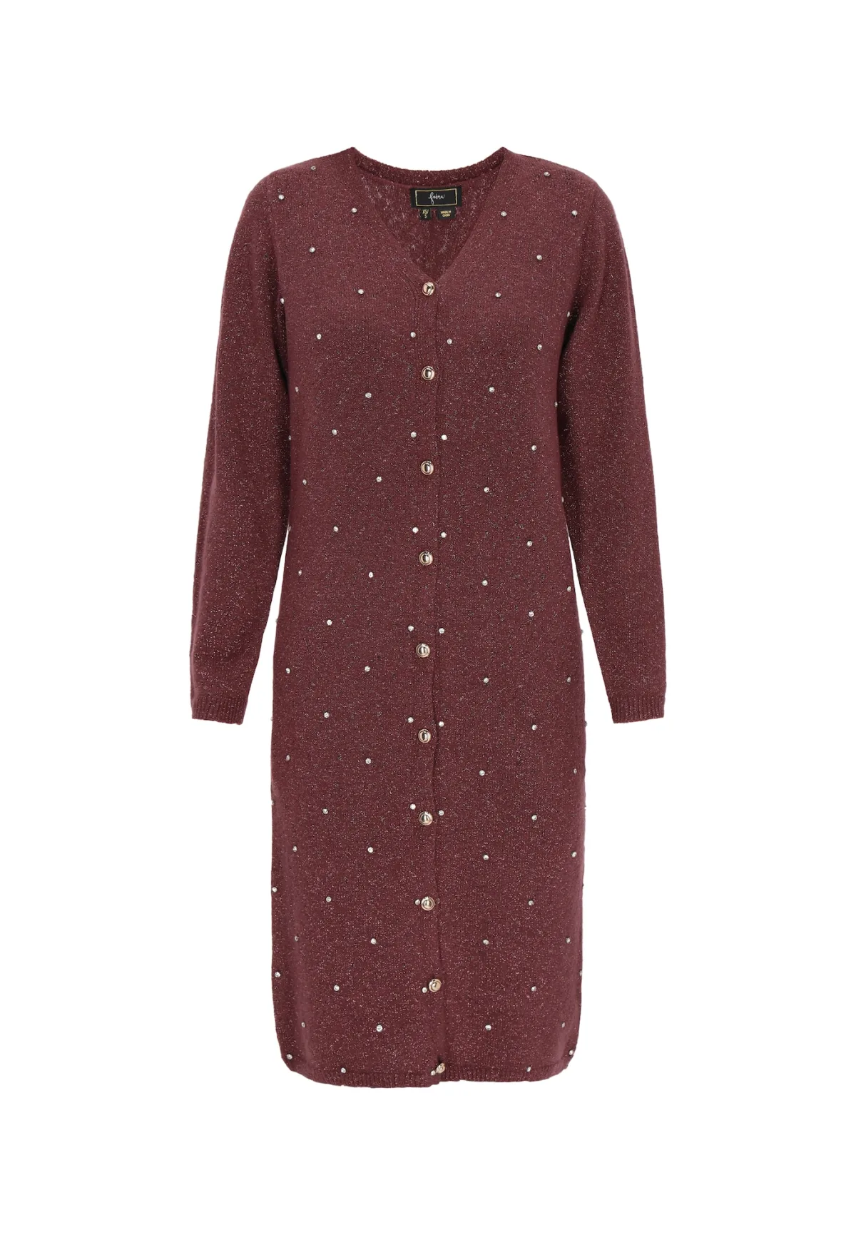 Design: Knop placket, Geribd ceintuurtje; Type sluiting: Knoopsluiting; Materiaal: Knitwear; Halstype: V-hals; Details: Sierstenen; Extra's: All-over patroon, Applicaties; Pasvorm: Normale pasvorm; Armlengte: Lange mouw; Lengte: Lange pasvorm