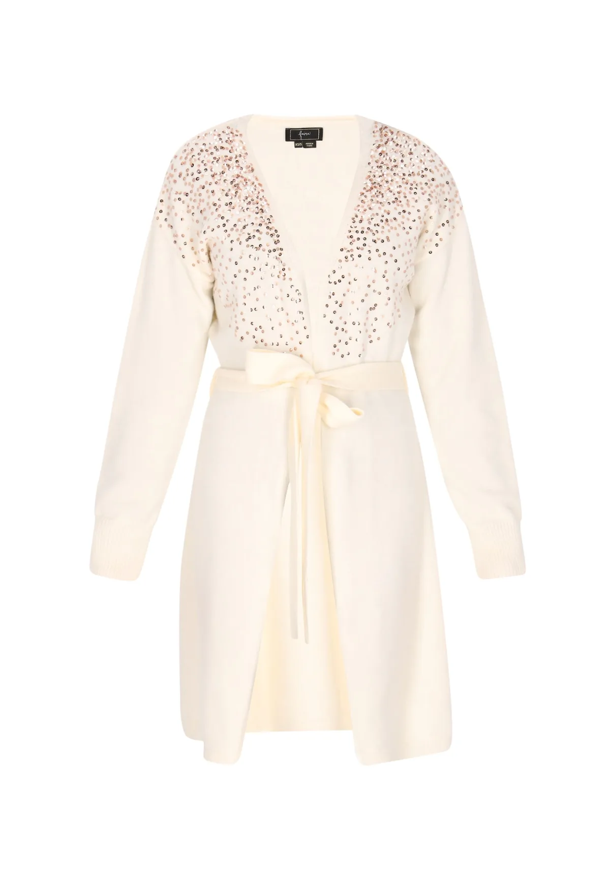 Design: Tailleriem, Zonder sluiting; Materiaal: Knitwear; Halstype: V-hals; Details: Pailletten; Extra's: Glitterend, Fully fashioned; Pasvorm: Normale pasvorm; Armlengte: Lange mouw; Lengte: Lange pasvorm