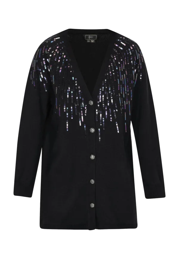 Transformeer je stijl met dit lange, elegante vest met V-hals dat charme uitstraalt. Versierd met sprankelende pailletten en stijlvolle knopen, geeft het elke outfit verfijning. De zachte gebreide stof zorgt voor comfort, terwijl de geribde manchetten en zoom de verfijnde uitstraling versterken. Deze warme trui met lange mouwen is de perfecte keuze voor een elegant evenement. Vest