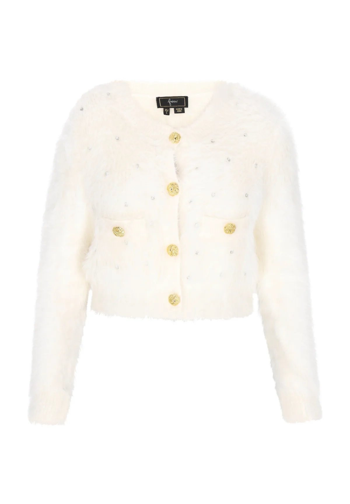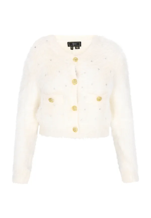 Design: Geribbelde kraag, Knop placket, Opgezette zakken; Type sluiting: Knoopsluiting; Materiaal: Nepbont; Halstype: Ronde hals; Motief: Effen; Details: Sierstenen; Extra's: Applicaties, Voelt zacht aan; Pasvorm: Normale pasvorm; Armlengte: Lange mouw; Lengte: Korte pasvorm
