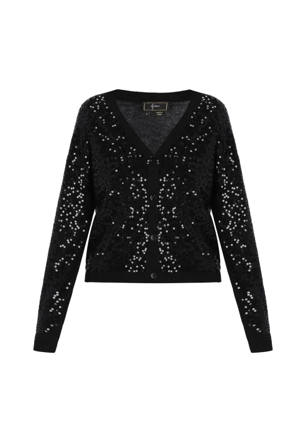 Design: Rechte zoom, Knop placket; Type sluiting: Knoopsluiting; Materiaal: Knitwear; Halstype: V-hals; Motief: Effen; Details: Pailletten; Extra's: Glitterend, Met textuur; Pasvorm: Normale pasvorm; Armlengte: Lange mouw; Lengte: Normale lengte