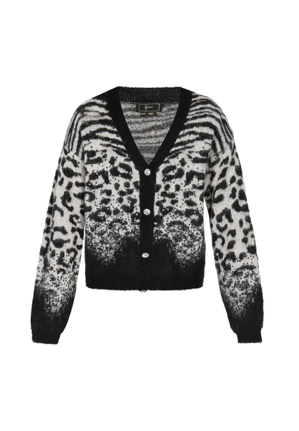 Design: Knop placket, Geribd ceintuurtje, Overcut schouder; Type sluiting: Knoopsluiting; Materiaal: Knitwear; Halstype: V-hals; Motief: Dierenprint; Details: Pailletten; Extra's: All-over patroon, Applicaties; Pasvorm: Wijde pasvorm; Armlengte: Lange mouw; Lengte: Normale lengte