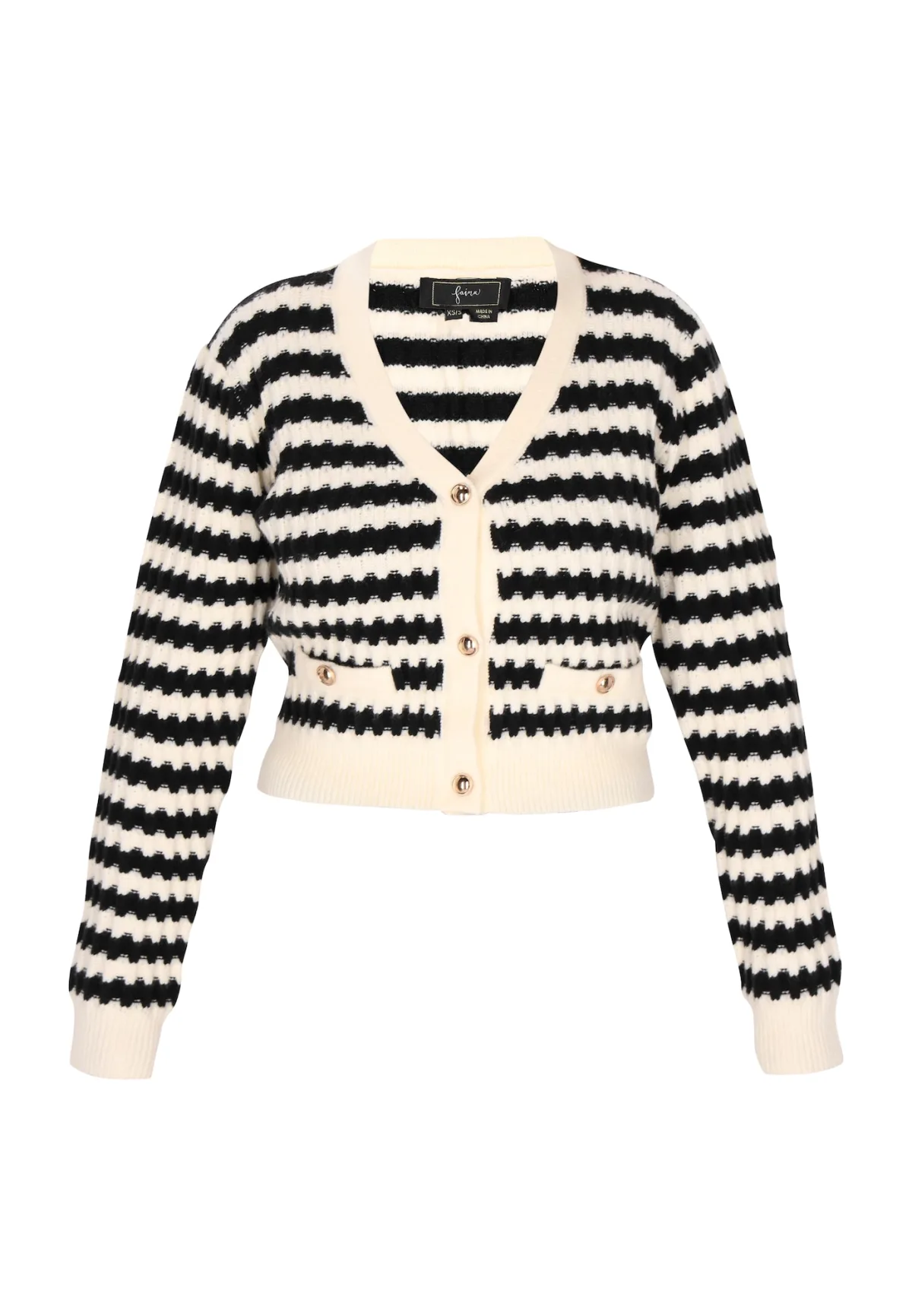 Design: Paspelzak; Type sluiting: Plakgesp; Materiaal: Knitwear; Halstype: V-hals; Motief: Gestreept; Pasvorm: Normale pasvorm; Armlengte: Lange mouw; Lengte: Korte pasvorm