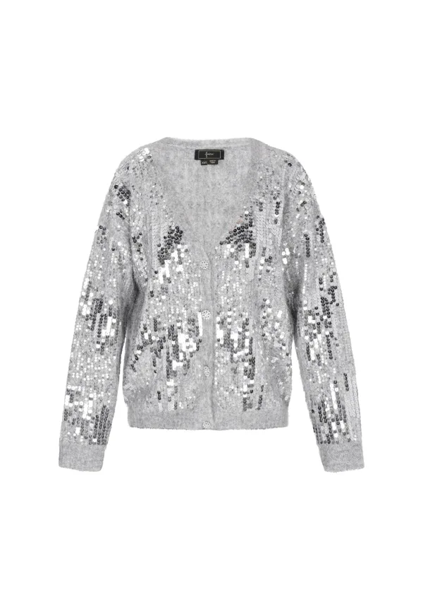 Design: Knop placket, Geribd ceintuurtje; Type sluiting: Knoopsluiting; Materiaal: Knitwear; Halstype: V-hals; Details: Pailletten, Sierstenen; Extra's: Glitterend; Pasvorm: Losse pasvorm; Armlengte: Lange mouw; Lengte: Normale lengte