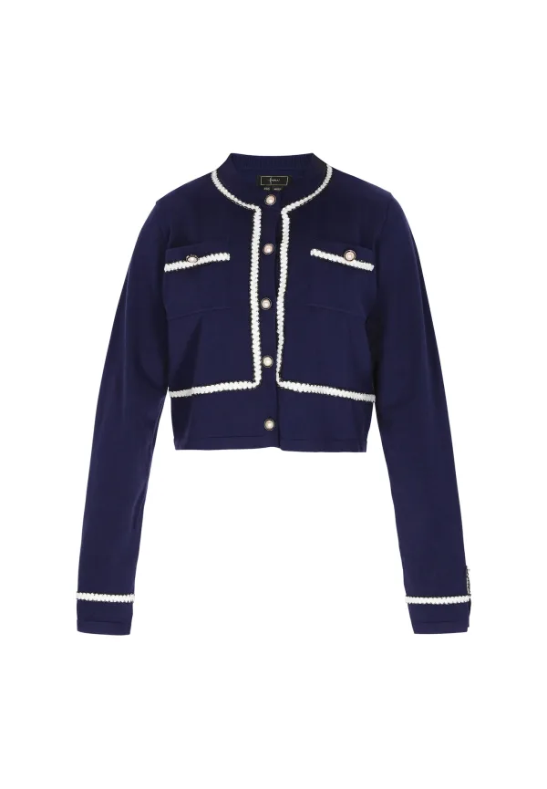 Design: Rechte zoom, Knop placket, Borstzak, Contrasterende inserts; Type sluiting: Knoopsluiting; Type jas: Indoor; Voering: Niet gevoerd; Materiaal: Knitwear; Halstype: Ronde hals; Motief: Effen; Extra's: Glitterend, Op staal naden; Pasvorm: Slanke pasvorm; Armlengte: Lange mouw; Lengte: Korte pasvorm