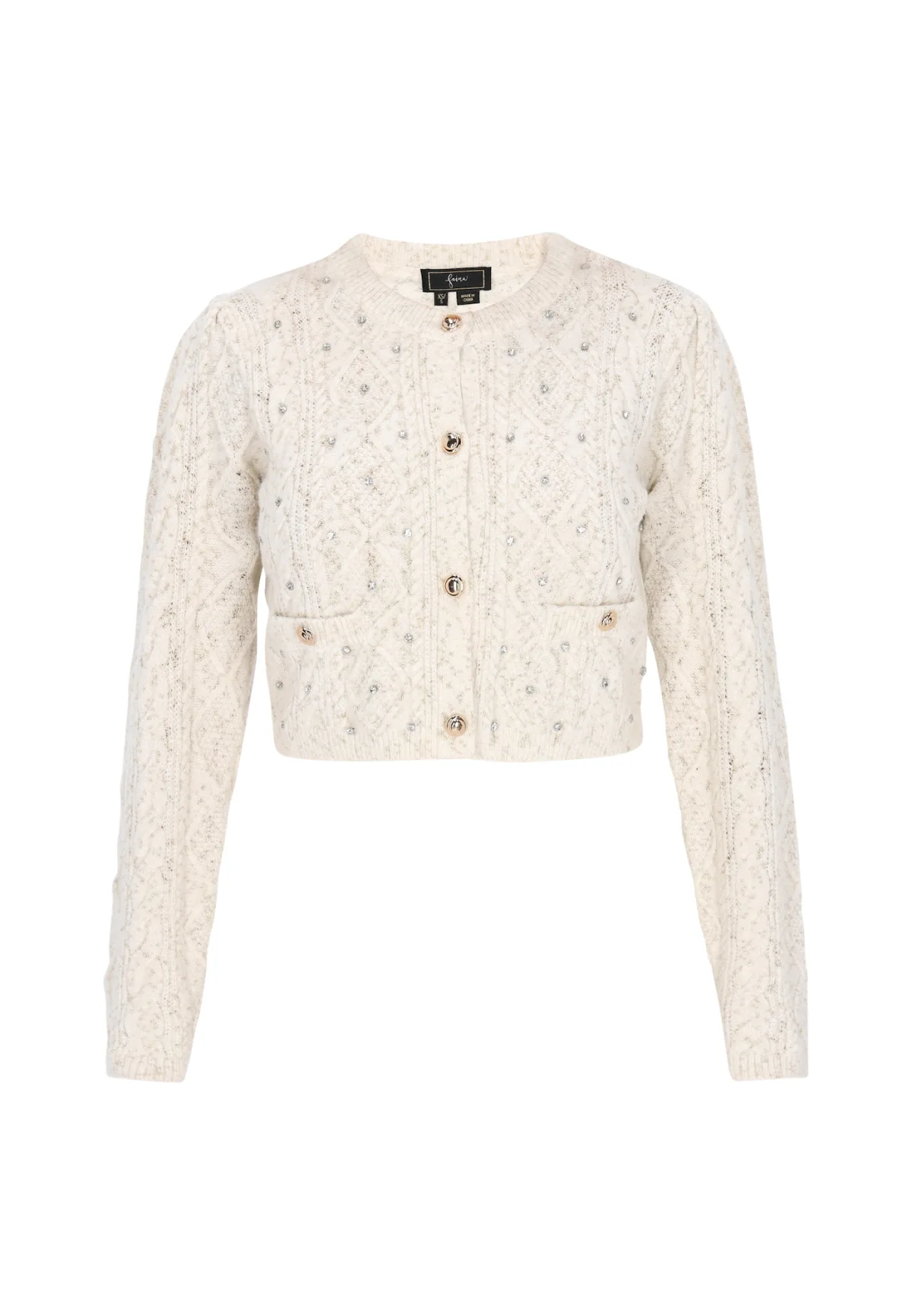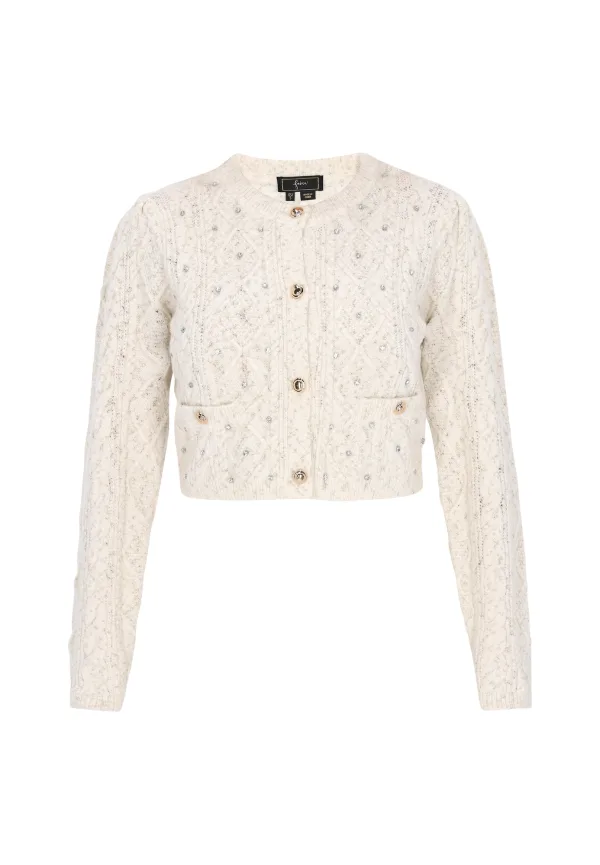 Design: Vlecht brei; Type sluiting: Knoopsluiting; Materiaal: Knitwear; Halstype: Ronde hals; Motief: Mélange; Details: Sierstenen; Extra's: Applicaties; Pasvorm: Slanke pasvorm; Armlengte: Lange mouw; Lengte: Korte pasvorm