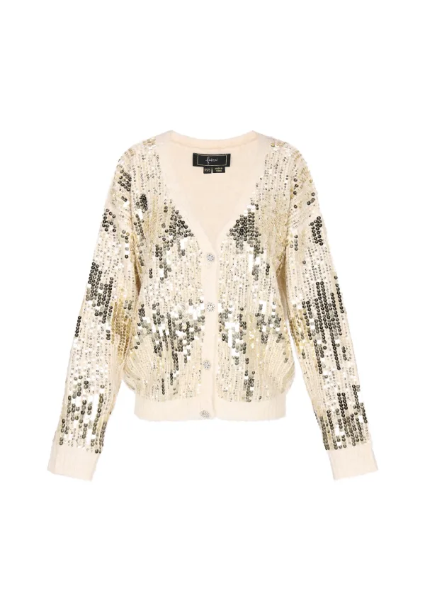 Design: Geribd ceintuurtje, Geribbeld gebreid, Overcut schouder; Type sluiting: Knoopsluiting; Materiaal: Knitwear; Halstype: V-hals; Details: Pailletten, Sierstenen; Extra's: Glitterend; Pasvorm: Losse pasvorm; Armlengte: Lange mouw; Lengte: Normale lengte