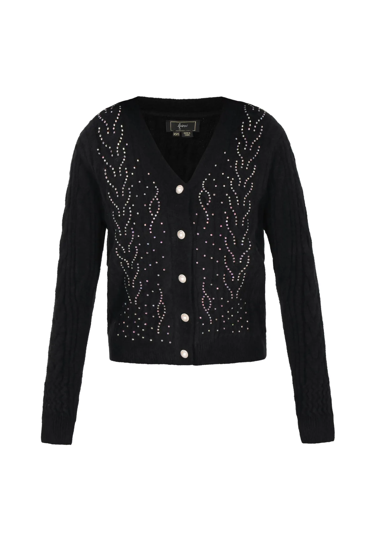 Design: Rechte zoom, Knop placket, Geribd ceintuurtje; Type sluiting: Knoopsluiting; Materiaal: Knitwear; Halstype: V-hals; Details: Sierstenen; Extra's: Glitterend, Op staal naden; Pasvorm: Normale pasvorm; Armlengte: Lange mouw; Lengte: Normale lengte