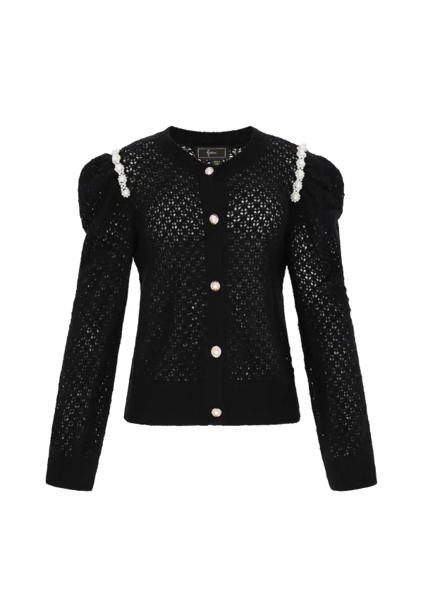 Design: Knop placket, Pofmouwen; Type sluiting: Knoopsluiting; Materiaal: Knitwear; Halstype: Ronde hals; Motief: Effen; Details: Gedrapeerd, Mesh, Parels; Extra's: Met textuur, Voelt zacht aan; Pasvorm: Normale pasvorm; Armlengte: Lange mouw; Lengte: Normale lengte