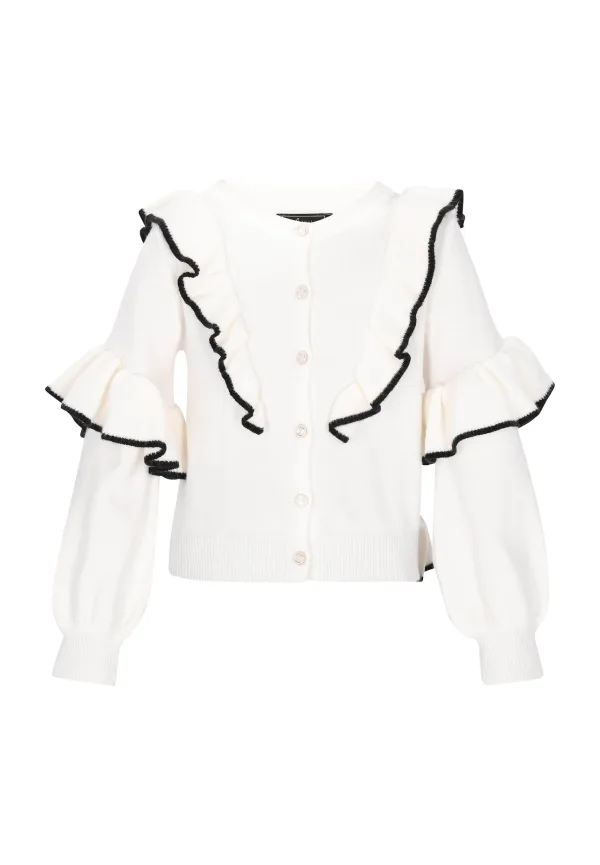 Design: Geribbelde kraag, Knop placket, Pofmouwen, Geribbeld gebreid; Type sluiting: Knoopsluiting; Materiaal: Knitwear; Halstype: Ronde hals; Motief: Effen; Details: Ruches; Extra's: Op staal naden; Pasvorm: Normale pasvorm; Armlengte: Lange mouw; Lengte: Normale lengte