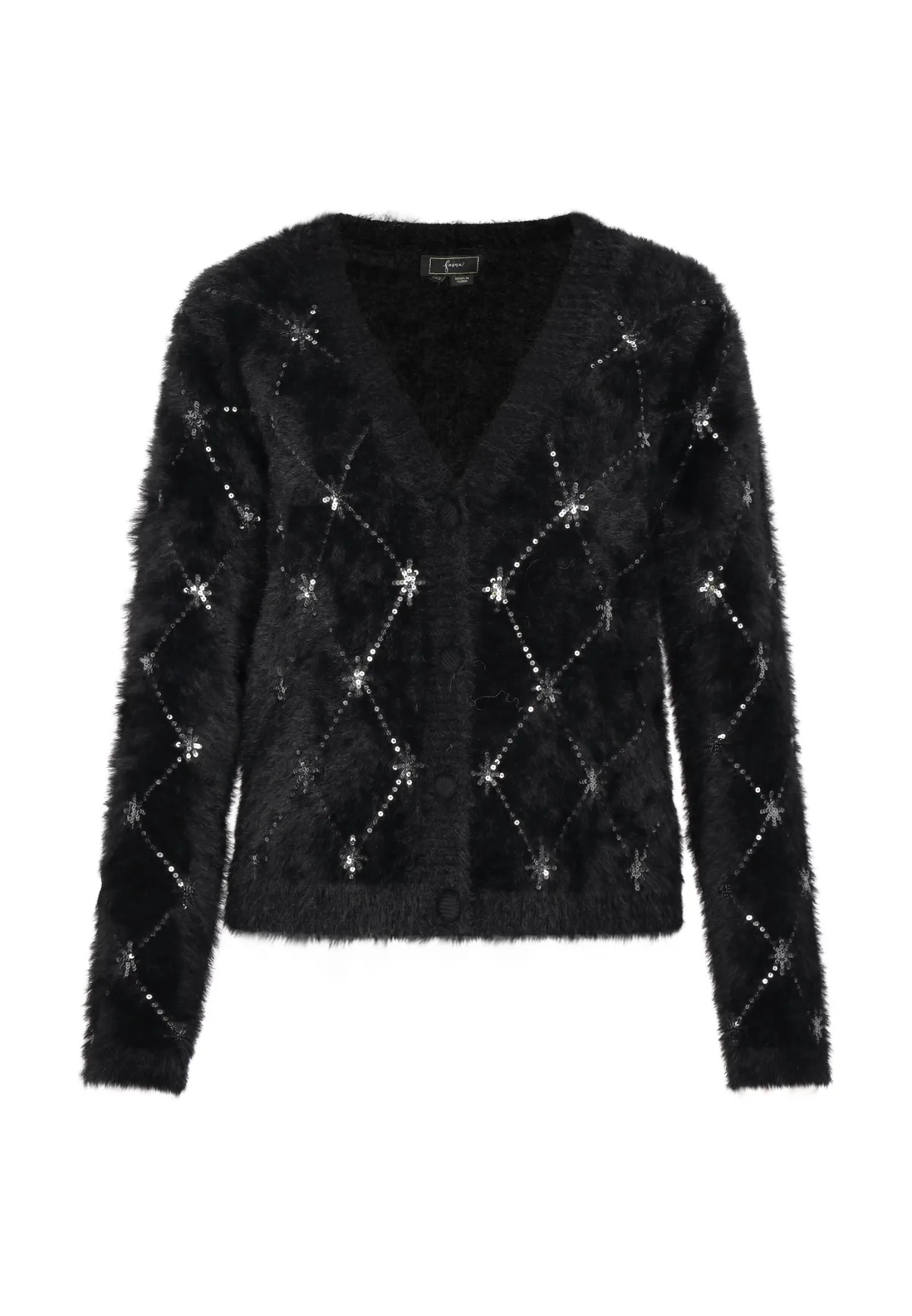 Geef je garderobe een boost met dit verfijnde vest met V-hals en lange mouwen met een stijlvolle knoopsluiting aan de voorkant. Versierd met ingewikkelde versieringen in een prachtig ruitvormig ontwerp, straalt dit elegante stuk charme en flair uit. Glanzende verfijning, waardoor het een ideale keuze is voor elke gelegenheid of evenement. Vest