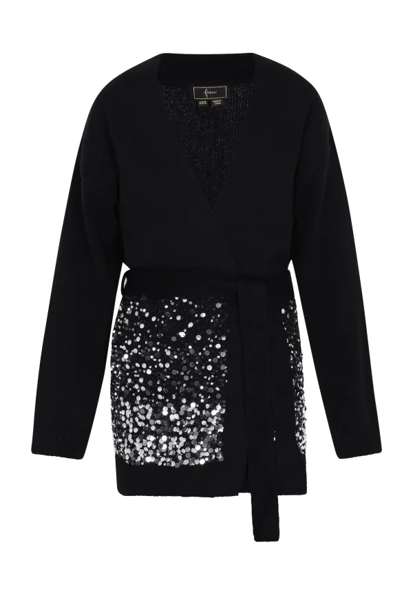Verrijk je wintergarderobe met dit elegante lange vest, ontworpen voor comfort en stijl. Met een V-hals, lange mouwen en een verstelbare riem voor een perfecte pasvorm. De gebreide stof heeft geribbelde manchetten en zoom, terwijl de onderkant is versierd met bling pailletten, waardoor het ideaal is voor feestelijke gelegenheden of formele evenementen. Vest