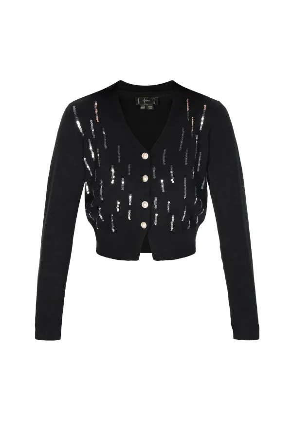 Design: Knop placket, Geribd ceintuurtje; Type sluiting: Knoopsluiting; Materiaal: Knitwear; Halstype: V-hals; Details: Pailletten; Extra’s: Glitterend; Pasvorm: Normale pasvorm; Armlengte: Lange mouw; Lengte: Korte pasvorm