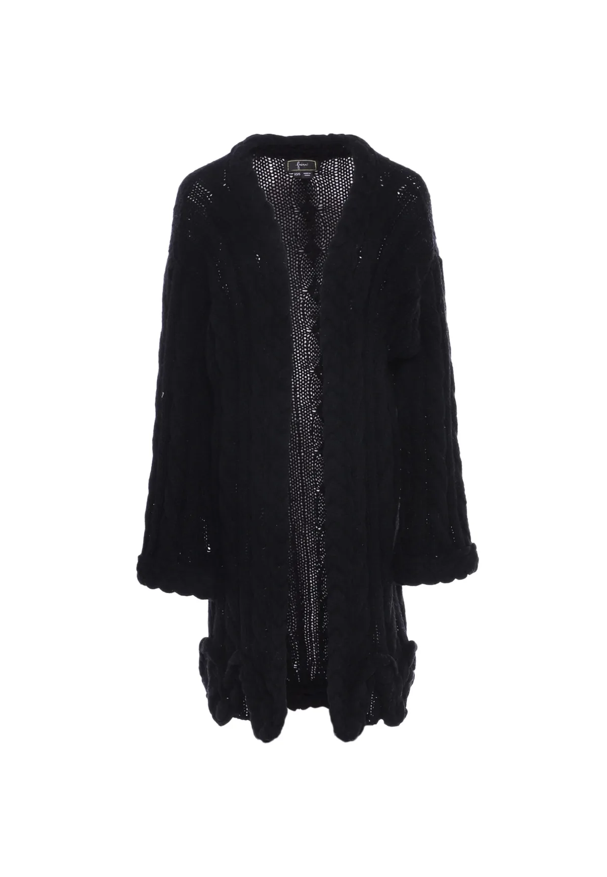 Het lange vest van faina is gemaakt van een zacht garen. Een all-over kabelpatroon en een kabelrand vormen de focus, net als de sterk golvende zoom. Vest trui