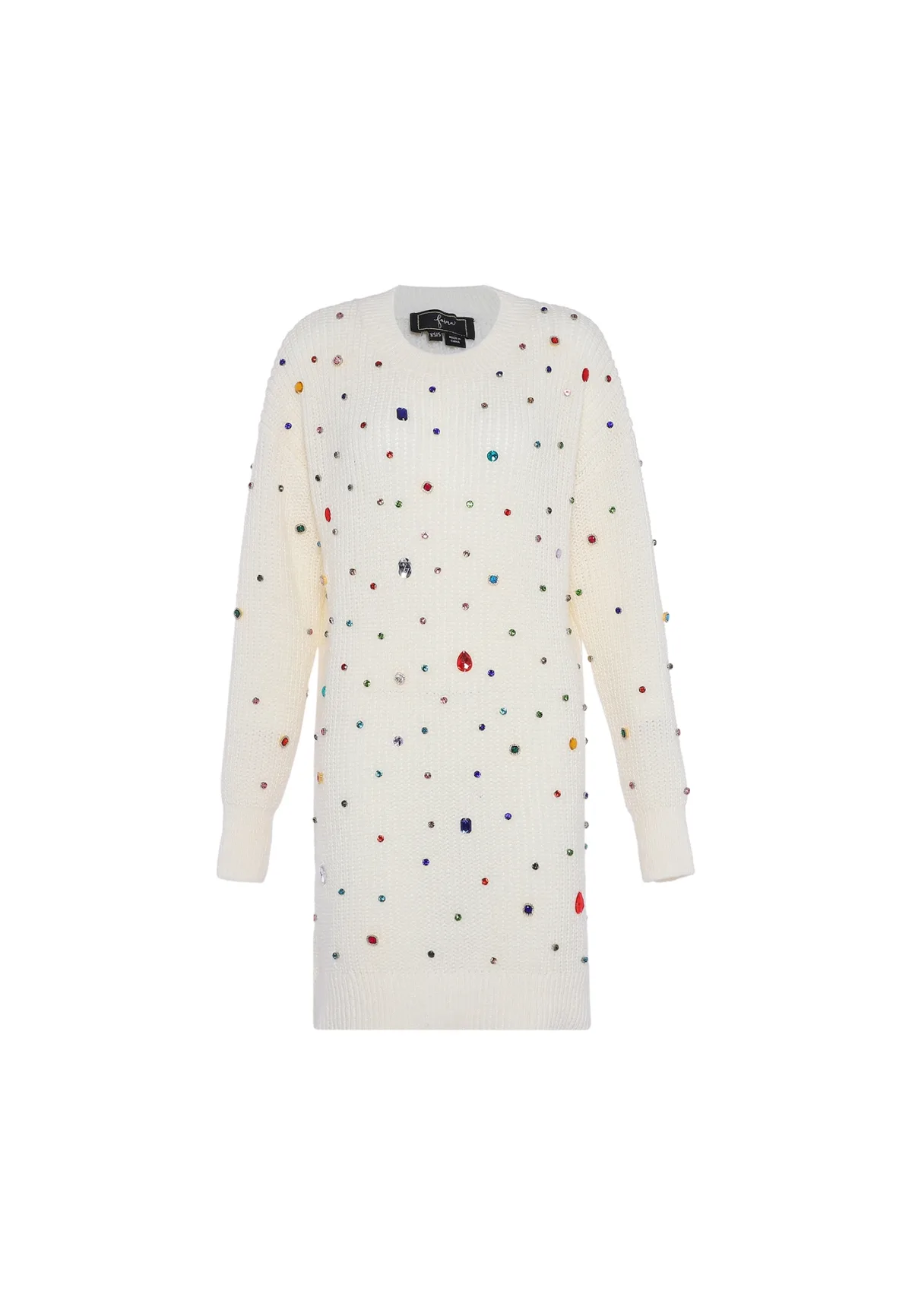 Maak kennis met een boeiende trui met lange mouwen, ronde hals en geribbelde textuur. Versierd met verspreide versieringen straalt dit kledingstuk een feestelijke charme uit. De fijn geribde halslijn, manchetten en zoom zorgen voor een comfortabele pasvorm, terwijl het losse silhouet comfort biedt. Uniek qua ontwerp, de verschillende maten en vormen van de versieringen voegen een opvallend detail toe aan dit gebreide kledingstuk dat het bovenlichaam tot aan de heupen bedekt. jurk
