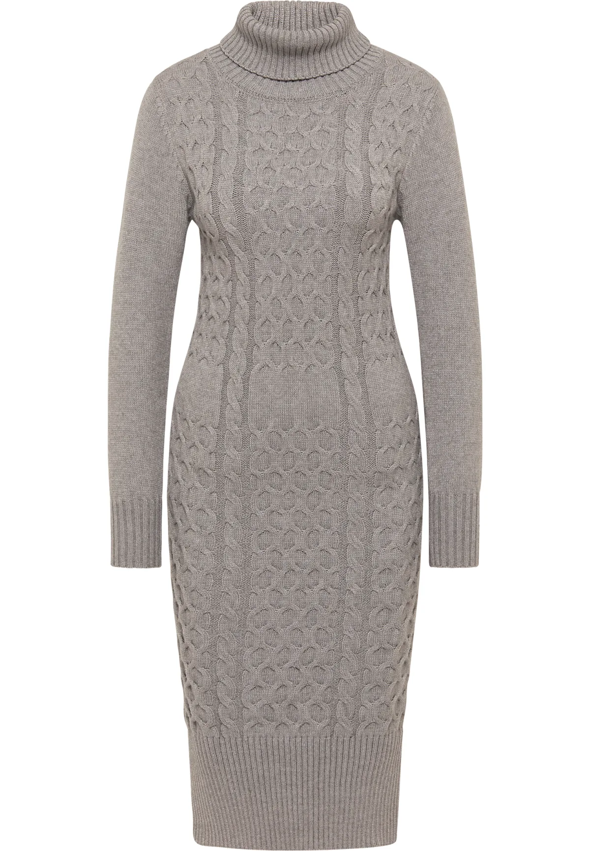 Deze gebreide jurk van faina bewijst dat winterse outfits en elegantie geen tegenstrijdige eigenschappen zijn. De zachte, fijn gebreide viscosemix kreeg een licht aansluitende vorm die meteen een heerlijk vrouwelijk silhouet oproept. De col en de lange mouwen benadrukken de vrouwelijke expressie nog meer. De mix van ketting- en zacht rasterbreisel volgt perfect de snit en geeft bovendien een spannende, levendige textuur aan het geheel. De twee zijsplitten in de zoom zorgen niet alleen voor een perfecte pasvorm en draagcomfort, maar benadrukken ook de fijne lijnen van de knieën en kuiten. Deze spannende basic is een subtiele maar effectieve aanvulling op uw pumps of elegante enkellaarsjes.