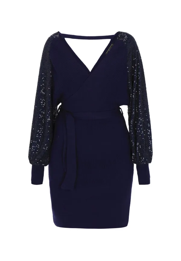 Design: Rechte zoom, Tailleriem; Materiaal: Knitwear; Halstype: V-hals; Motief: Effen; Details: Pailletten, Wikkel design; Extra's: Applicaties; Lengte: Knielengte; Pasvorm: Slanke pasvorm; Armlengte: Lange mouw