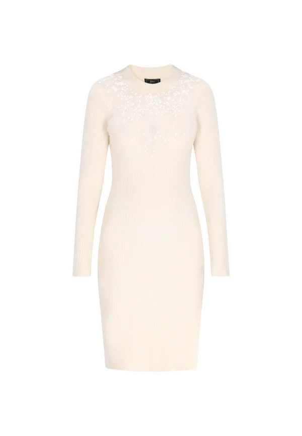 Design: Geribbeld gebreid; Type sluiting: Slip; Materiaal: Viscose; Halstype: Ronde hals; Motief: Effen; Details: Pailletten; Extra's: Op staal naden; Lengte: Knielengte; Pasvorm: Slanke pasvorm; Armlengte: Lange mouw