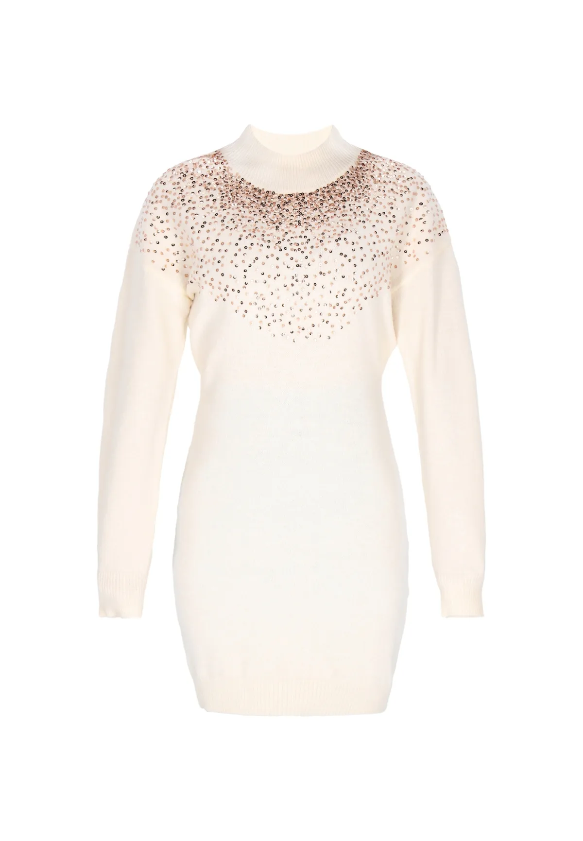 Design: Gevoerde zoom/rand; Type sluiting: Slip; Materiaal: Knitwear; Halstype: Opstaande kraag; Details: Pailletten; Extra's: Glinsterend, Fully fashioned; Lengte: Knielengte; Pasvorm: Slanke pasvorm; Armlengte: Lange mouw