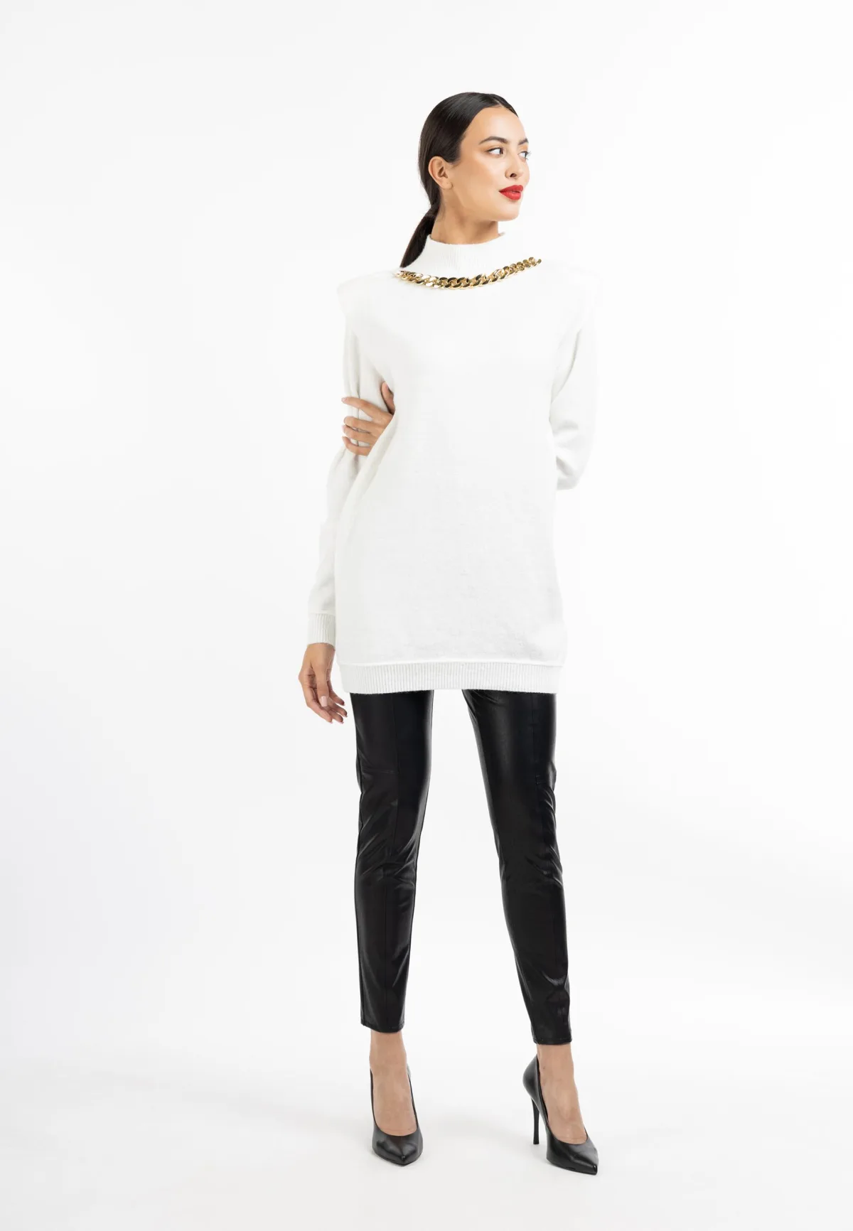 Als gebreide jurk of lange trui, dit model van faina belichaamt spannende elegantie. De opstaande kraag is versierd met een brede, goudkleurige ketting en is daarmee de blikvanger van deze gebreide jurk. Dankzij de casual snit en het zachte gebreide materiaal voelt u zich gegarandeerd comfortabel. Een beetje jaren 80 speelt ook mee: De brede schoudervullingen zorgen voor een spannend silhouet.