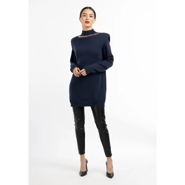 Als gebreide jurk of lange trui, dit model van faina belichaamt spannende elegantie. De opstaande kraag is versierd met een brede, goudkleurige ketting en is daarmee de blikvanger van deze gebreide jurk. Dankzij de casual snit en het zachte gebreide materiaal voelt u zich gegarandeerd comfortabel. Een beetje jaren 80 speelt ook mee: De brede schoudervullingen zorgen voor een spannend silhouet.