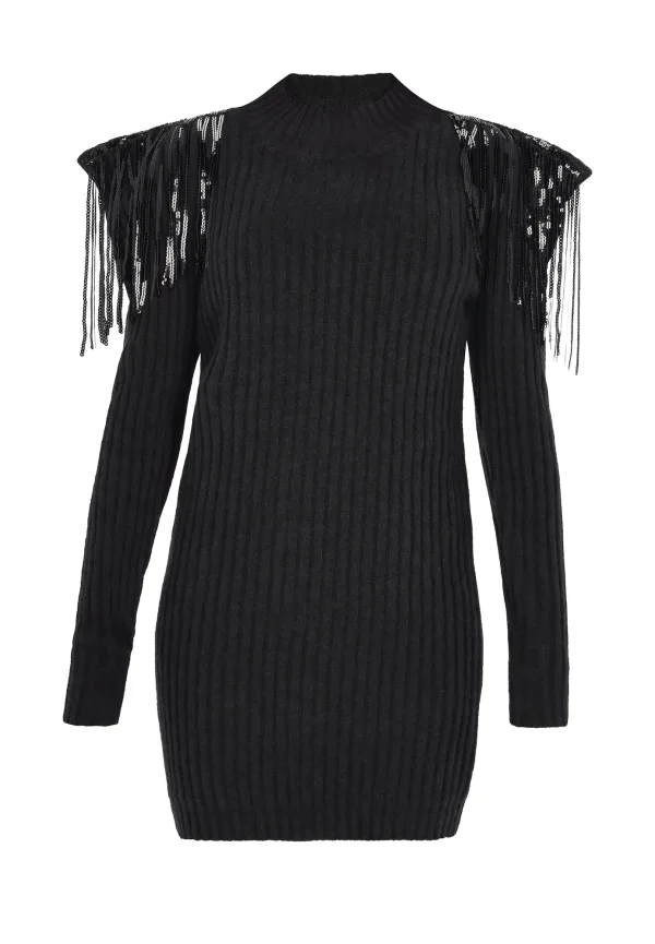 Geef je stijl een boost met deze elegante mini-jurk, gemaakt van gebreide stof. De hoge hals en lange mouwen creëren een verfijnd silhouet dat je figuur flatteert. Glanzende pailletten sieren het ontwerp en voegen een vleugje glamour toe, terwijl franjedetails op de schouders de allure versterken. Perfect voor elke gelegenheid. Jurk