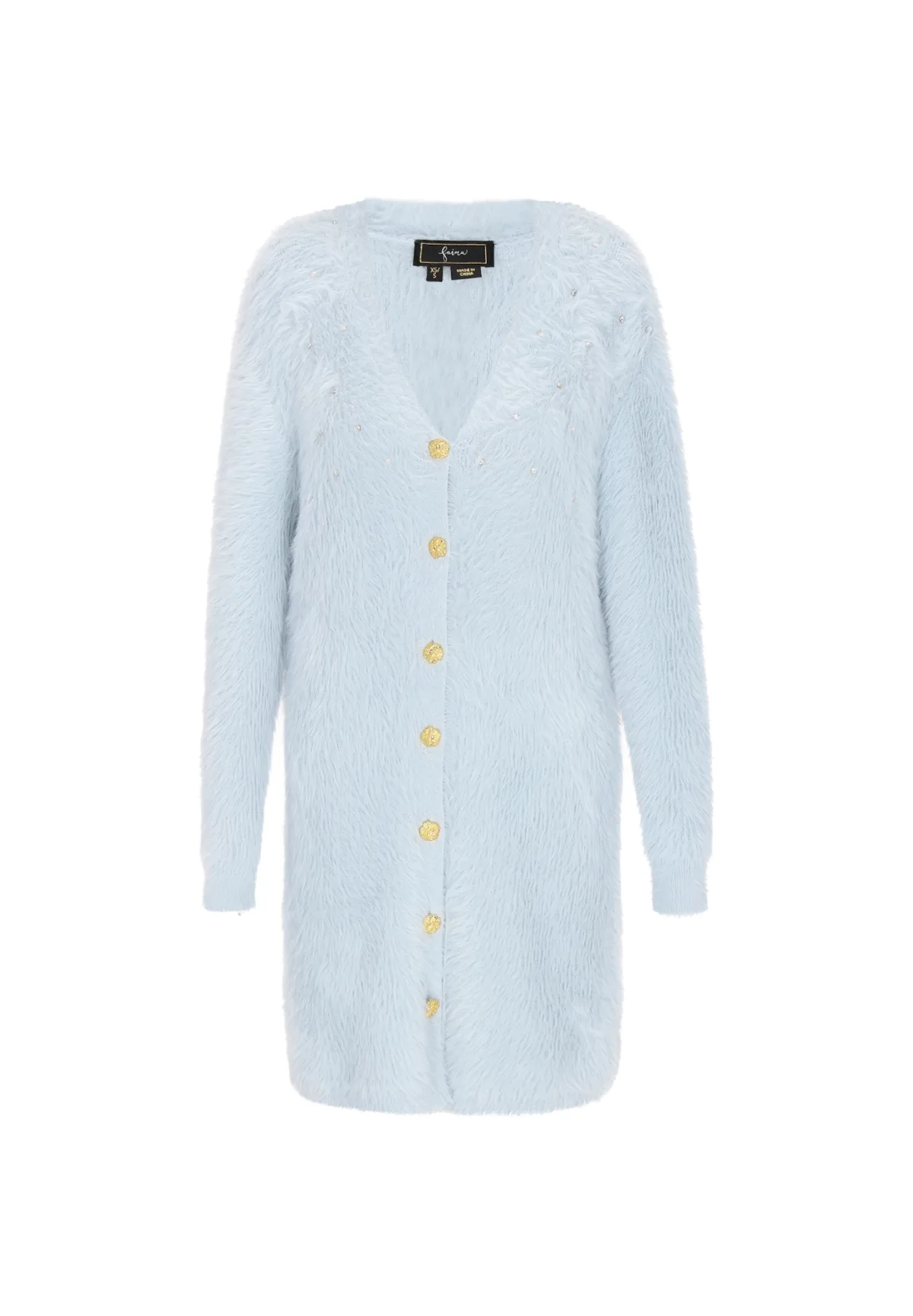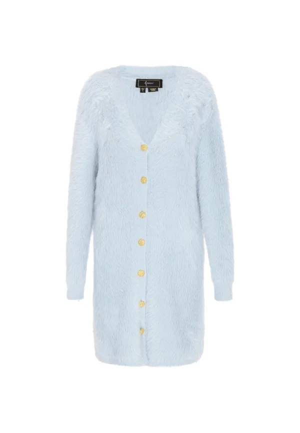 Design: Knop placket, Geribd ceintuurtje, Overcut schouder, Knop sluiting; Type sluiting: Knoopsluiting; Materiaal: Knitwear; Halstype: V-hals; Motief: Effen; Details: Sierstenen; Extra's: Applicaties, Op staal naden; Pasvorm: Normale pasvorm; Armlengte: Lange mouw; Lengte: Lange pasvorm