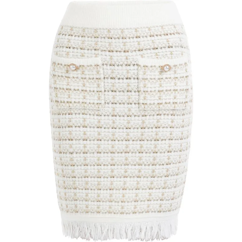 Deze vrouwelijke gebreide rok van faina straalt luxe en elegantie uit. Het grof gebreide, zachte garen vertoont een karakteristieke bouclé-look en is versierd met twee opgestikte zakken en betoverende knopen in parellook. De brede en elastische tailleband is bedekt met het breisel en de zoom van de rok onderbreekt het geruite dessin met zijn franjes, die zijn afgewisseld met metallic garen. Met deze rok heeft u een perfecte begeleider van opera tot kantoor, die prachtig past bij blouses of korte truien.