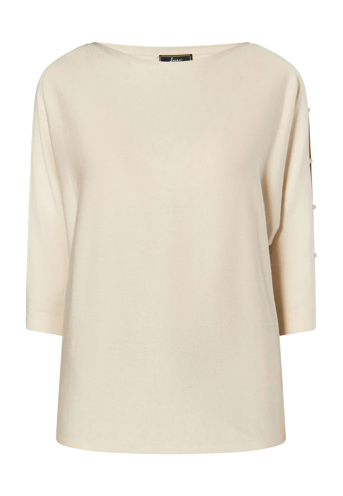 De nauwsluitende trui van faina krijgt een verfijnde twist dankzij de uitsneden op de vleermuismouwen die met parels zijn verbonden. Gemaakt van een zachte viscose garenmix, voelt de trui comfortabel aan op de huid, een boothals en een rechte zoom maken het elegante ontwerp compleet. Gebreide trui