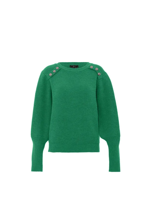 Deze gebreide trui is gemaakt voor comfort en stijl en heeft een geribbelde textuur met decoratieve knopen op de schouders. De ronde hals en strakke geribde zoom, manchetten en halslijn zorgen voor een gezellige pasvorm. Met een normale pasvorm en zachte textuur biedt dit elegante ontwerp warmte voor elke gelegenheid. Pullover trui