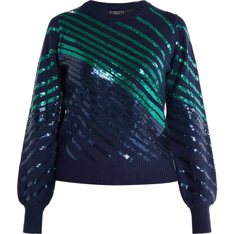 Geniet van feestelijke avonden in de trui van faina. De fijne garenmix met viscosegehalte voelt zacht aan op de huid terwijl de pailletten glinsteren. Het klassieke silhouet met ronde halslijn krijgt een elegante, modieuze twist dankzij de wijde mouwen en de lange geribde manchetten die voor volume zorgen. Gebreide trui