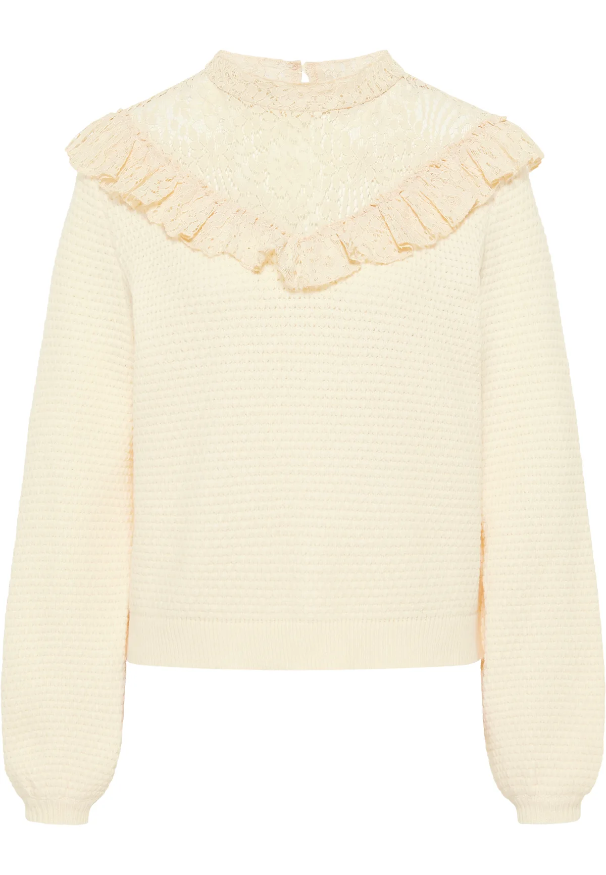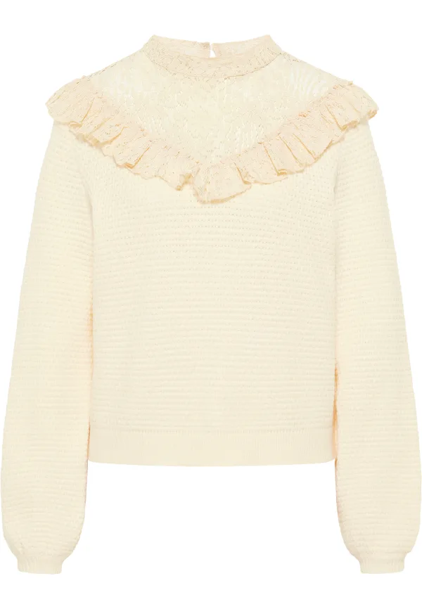 Geen voering/geen voering, geen vulling Met een handig spel van soberheid en fascinerende vrouwelijkheid valt deze gebreide trui van faina op. De hoog opstaande kraag en het zachte, dichte wafelbreisel volgen een duidelijk, zeker ontwerp. De licht gevormde ballonmouwen en de kortere, fijnmazige snit verzachten deze strenge lijnen heerlijk. De royale kanten inzet die het gedeelte rond hals, schouders en decolleté vormt, heeft een bijzonder effect. Een kleine opening net onder de kraagknopen en een kanten ruche langs de voor- en achterkraag geven een spannende en elegante vrouwelijkheid aan het geheel. Als zo'n levendige basic vult deze trui perfect uw effen, nauwsluitende rokken aan, evenals de broeken van het seizoen. Gebreide trui