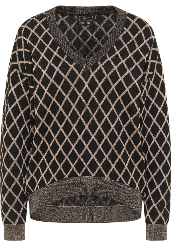 Geen voering/geen voering, geen vulling Als begeleiding bij formeel-casual gelegenheden, om een beetje glamour in het dagelijks leven te brengen ... Voor welke gelegenheid u deze gebreide trui van faina ook kiest, hij maakt gegarandeerd indruk. Levendig rasterpatroon met gouden glittereffecten zorgt direct voor een fascinerende uitstraling. De nonchalante, iets langere vorm aan de achterkant zorgt voor trendyheid en een speels, vrouwelijk geheel. Iets donkerder, glinsterende ribbeltjes zorgen voor een bijzonder, subtiel contrasterend accent. Met zijn losse pasvorm en tegelijkertijd feestelijke karakter is deze trui bijzonder aan te bevelen als combinatie met uw slanke, effen broek. Gebreide trui