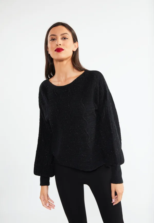 Laat je betoveren door deze prachtige gebreide trui van faina. De fijne details zoals de glinsterende vezel die schittert zodra er licht op valt of het gebreide patroon maken dat deze trui opvalt. De wijde mouwen worden aangevuld door de mouwuiteinden die bij de pols iets strakker zijn gesneden, wat bijzonder flatterend is.