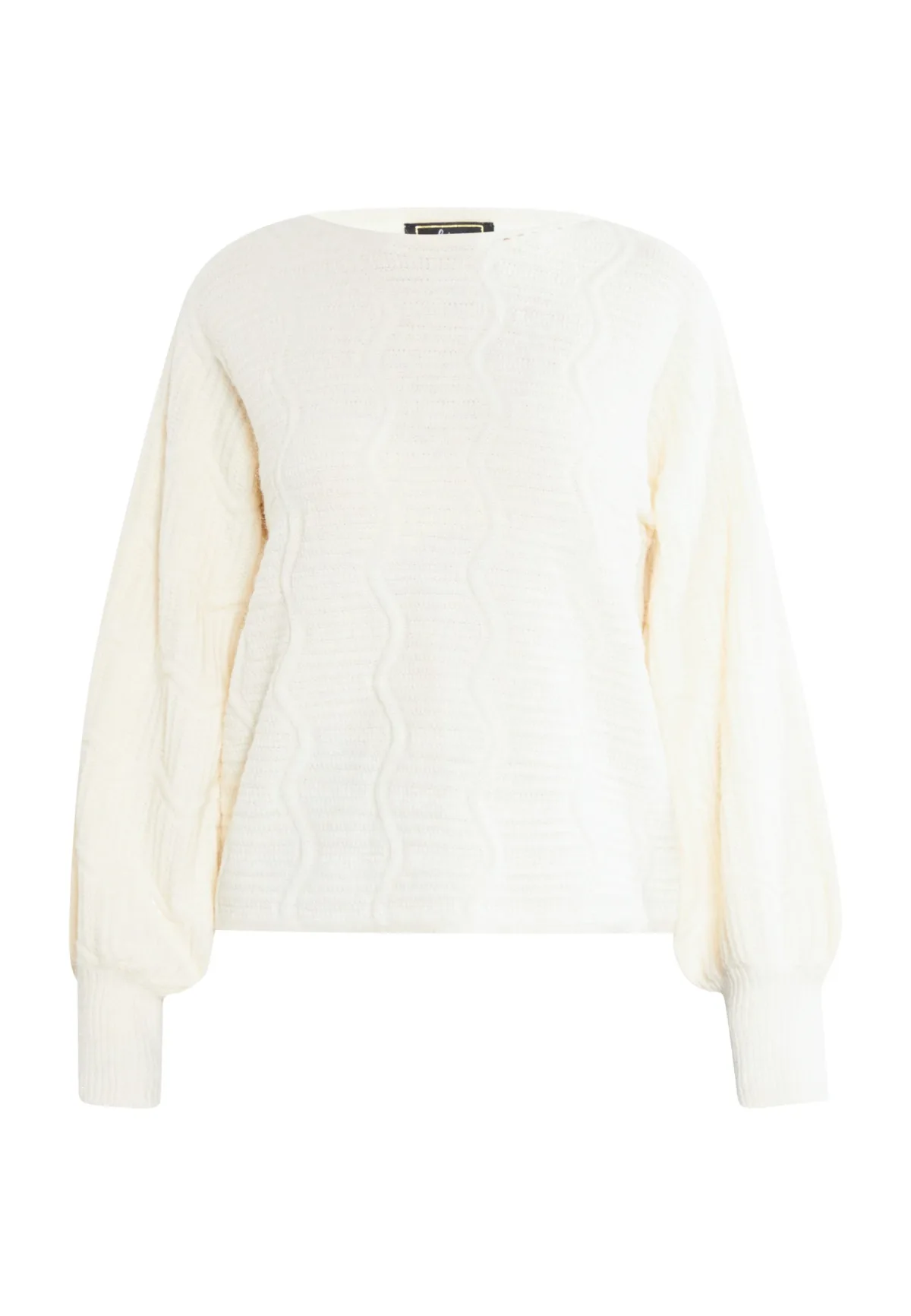 Laat je betoveren door deze prachtige gebreide trui van faina. De fijne details zoals de glinsterende vezel die schittert zodra er licht op valt of het gebreide patroon maken dat deze trui opvalt. De wijde mouwen worden aangevuld door de mouwuiteinden die bij de pols iets strakker zijn gesneden, wat bijzonder flatterend is.