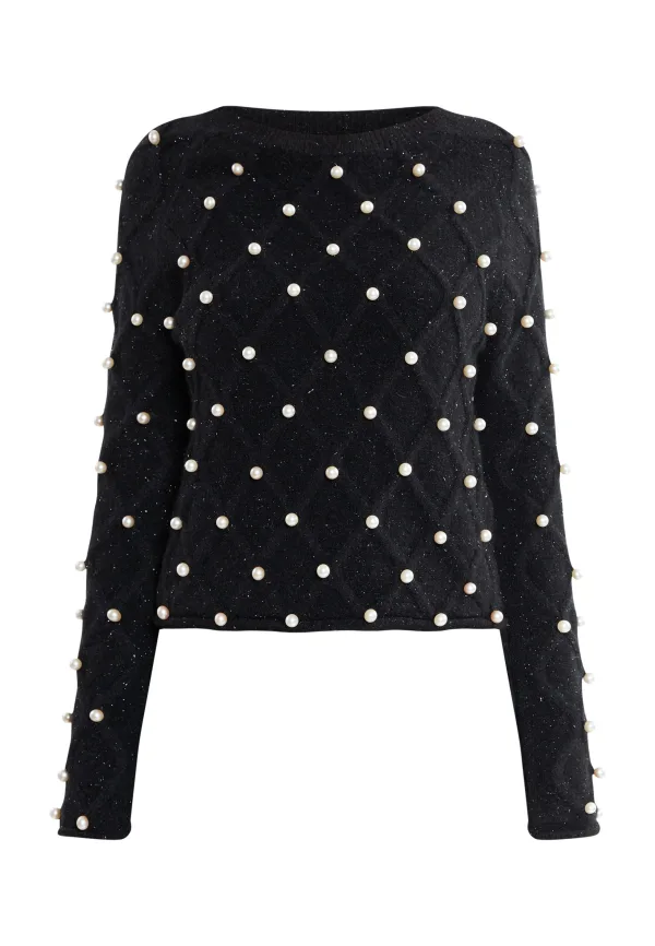 Deze gebreide trui van faina overtuigt door zijn vrouwelijke details. Op de mouwen en op de hele voorkant zijn decoratieve kralen op het ruitpatroon genaaid. Bij nader inzien zitten er fijne glittervezels in het breisel die prachtig glanzen zodra er licht op valt. De casual snit vormt een ideaal contrast met de vrouwelijke details.