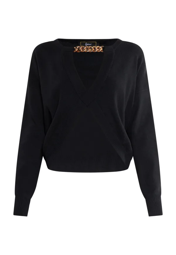Deze fancy gebreide creatie van faina geeft u geraffineerde glamour. De fijne garenmix met viscosegehalte verwent, terwijl de ronde halskraag versierd is met een brede, goudkleurige ketting, die de uitsparing op de borst extra benadrukt. Het decoratieve kruisje en de gevormde zoom aan de voorkant zetten de visuele accenten. Dankzij het korte model kan de trui uitstekend worden gecombineerd met een jeans met hoge taille en pumps.