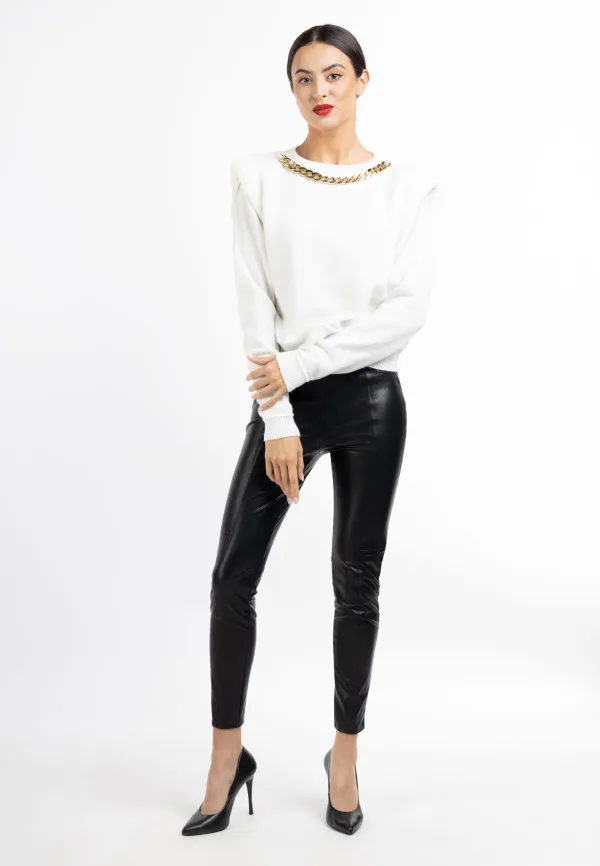 De gebreide trui van faina belichaamt spannende elegantie. De halslijn is versierd met een brede, goudkleurige ketting en is daarmee de blikvanger van dit model. Dankzij de casual snit en het zachte gebreide materiaal bent u verzekerd van een comfortabel gevoel. Een beetje jaren 80 speelt ook mee: De brede schoudervullingen zorgen voor een spannend silhouet.
