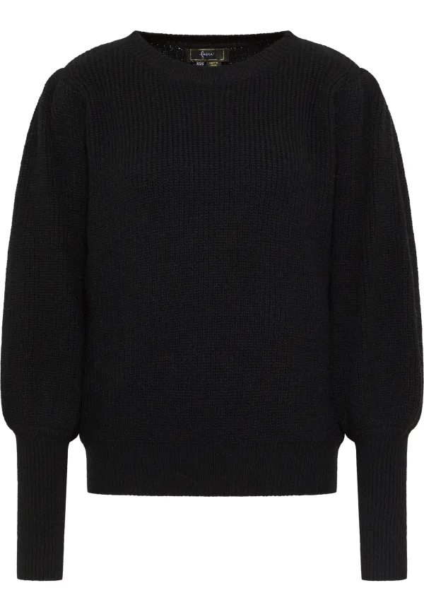 Deze basic gebreide trui van faina overtuigt met een geraffineerde touch. De zachte garenmix in geribd breisel wordt geaccentueerd met wijde pofmouwen die met hun lange gebreide manchetten een mooi volume krijgen. Een geribde ronde halslijn maakt het ontwerp compleet.