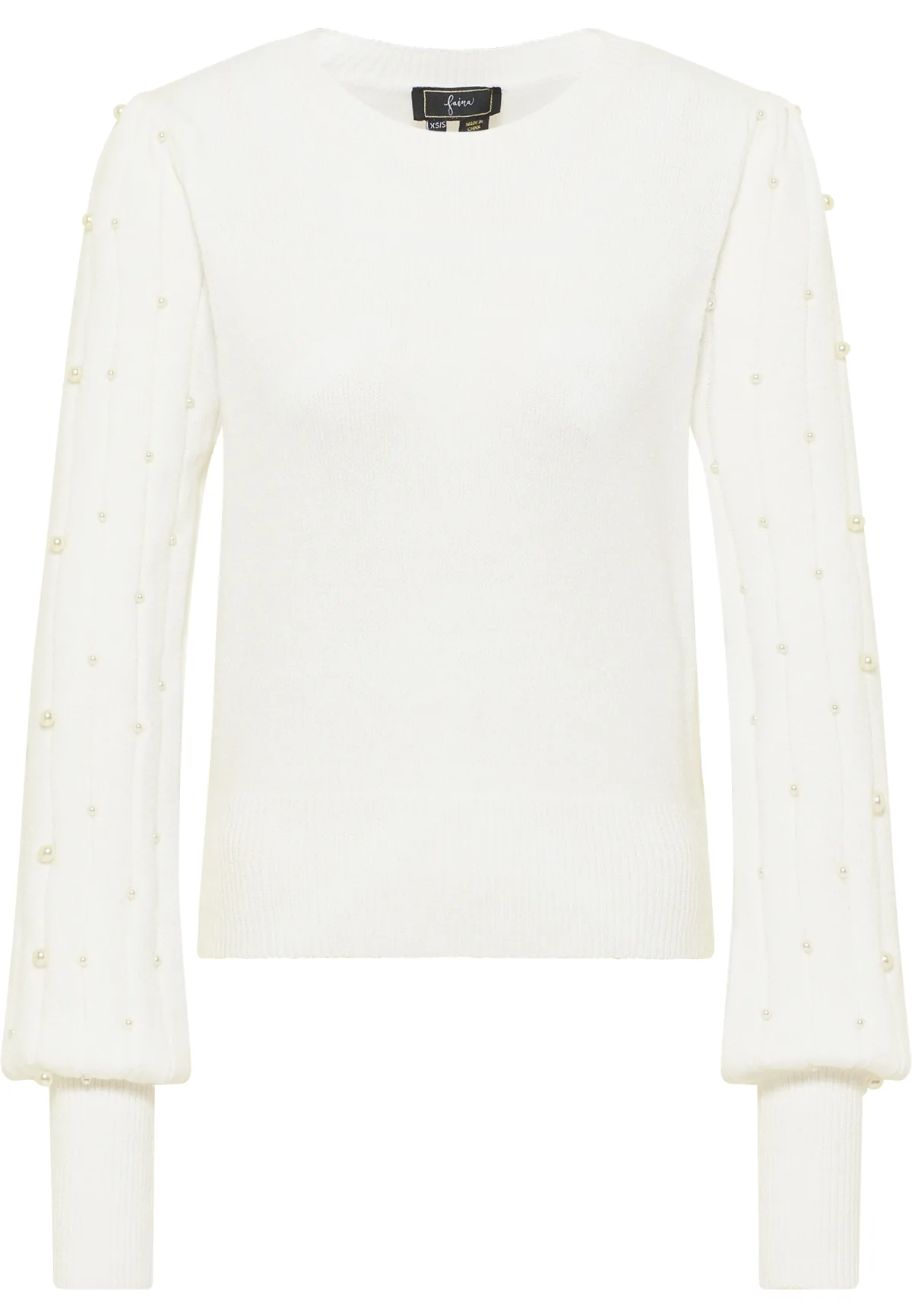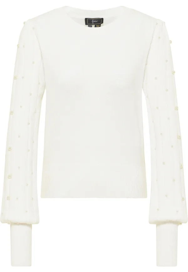 Deze trui van faina is een elegante aanvulling op uw gebreide garderobe. Het fijne en zachte garen met viscosegehalte voelt stabiel aan en wordt geaccentueerd door het langgerekte breipatroon op de mouwen en de decoratieve kralen. De ronde halslijn en de lange manchetten ronden het model af met hun geribde breiwerk.
