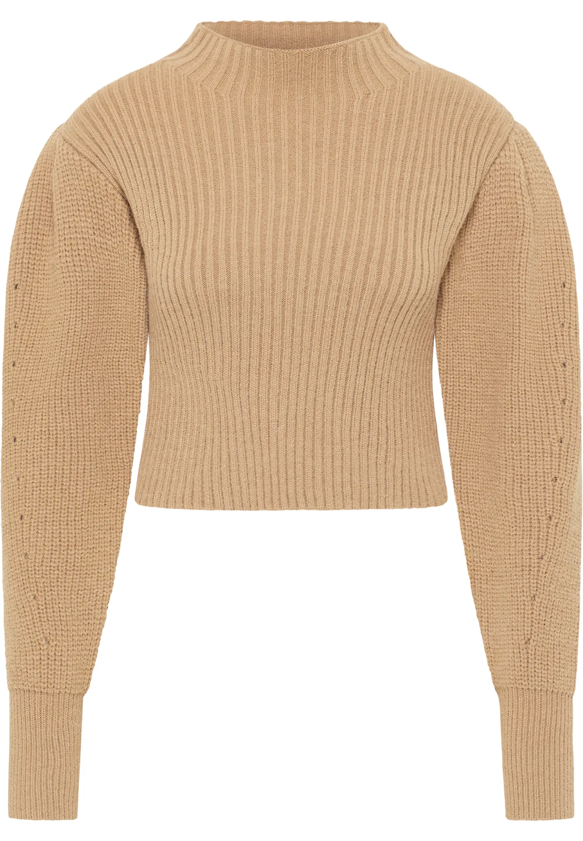 Deze zachte geribde trui van faina heeft een slank model, wijde pofmouwen met lange manchetten en een kleine opstaande kraag. Het ontwerp is gemaakt van een zachte, rekbare garenmix die zeer comfortabel is om te dragen. De kortere vorm past perfect bij hoog getailleerde broeken en vrouwelijke kokerrokken.
