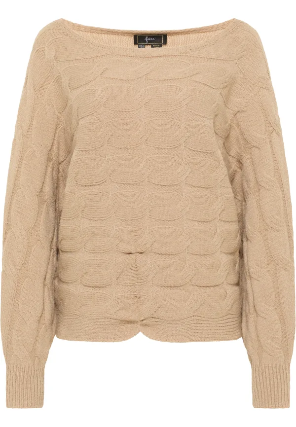 Een horizontaal kabelpatroon siert de voorkant van deze gebreide trui. Naast de zachte garenmix zult u dol zijn op de losse pasvorm met vleermuismouwen. Dit veelzijdige model zal uw wintergarderobe verrijken.