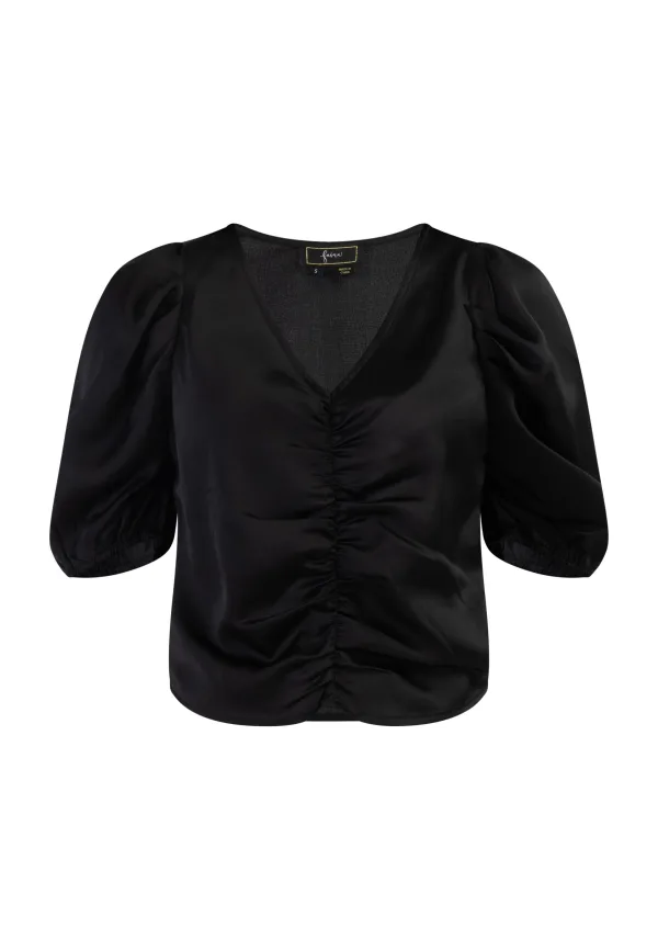 Deze vrouwelijke top is gemaakt door faina van glanzend satijn en versierd met sensuele details. De diepe V-hals met het gedrapeerde en geplooide middenstuk straalt net zoveel glamour uit als de korte pofmouwen met elastische manchetten. Zakelijk met een pantalon of 's avonds met een vrouwelijke kokerrok: deze blouse is een perfecte metgezel. Blouse