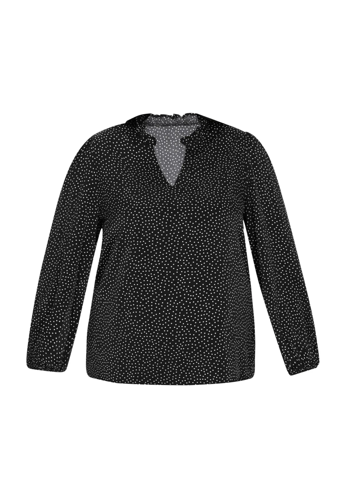 Ontdek de elegantie van deze stijlvolle plus-size blouse uit onze Plus Size Collectie. Met een inkeping in de hals en lange mouwen zorgt hij voor een flatterend silhouet. De geweven stof heeft een charmante stippenprint en de elastische manchetten zorgen voor een chique uitstraling. Dit elegante item is perfect te combineren met een aansluitende broek voor een chique, opvallende look. Grote maat blouse