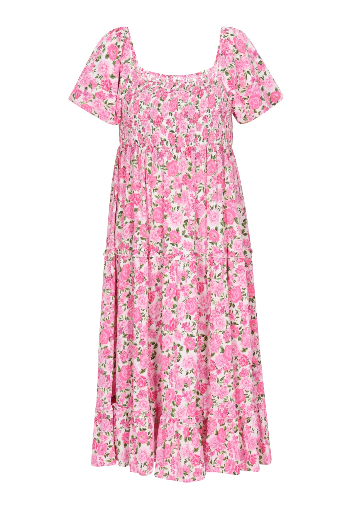 Deze maxi-jurk in grote maten heeft een romantische rozenprint, ideaal voor een vrouwelijke en date-ready look. Met korte pofmouwen en een rechthoekige hals zorgt het smockdesign met plooien voor een comfortabele pasvorm. Het losse onderstuk met delicate ruches geeft de jurk volume en cre Grote maten jurk