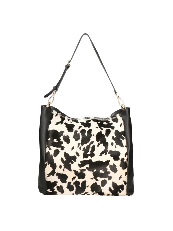 Deze trapeze-handtas is perfect voor casual gebruik, met een ruim hoofdvak voor A4-items. De verstelbare en afneembare riem zorgt voor comfort, terwijl de metalen elementen duurzaamheid garanderen. De tas heeft twee compartimenten, een binnenvak en een ritssluiting voor extra veiligheid. De koeienprint aan de buitenkant geeft een unieke touch aan het moderne en stijlvolle design in onze Fashion Look-collectie. Handtas