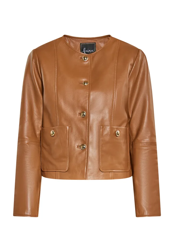 Ontdek een klassiek leren jack met een kortere snit en een ronde halslijn voor een elegante touch. De sluiting aan de voorkant is versierd met metalen knopen, net als de twee open zakken aan de voorkant. Lange mouwen en een getailleerde pasvorm creëren een verfijnd silhouet, terwijl de gladde textuur naar luxe verwijst. Dit chique exemplaar straalt tijdloze charme uit met zijn gestructureerde naden en verfijnde details. Dit product maakt deel uit van de Soft Lamb Leather Collection Jas