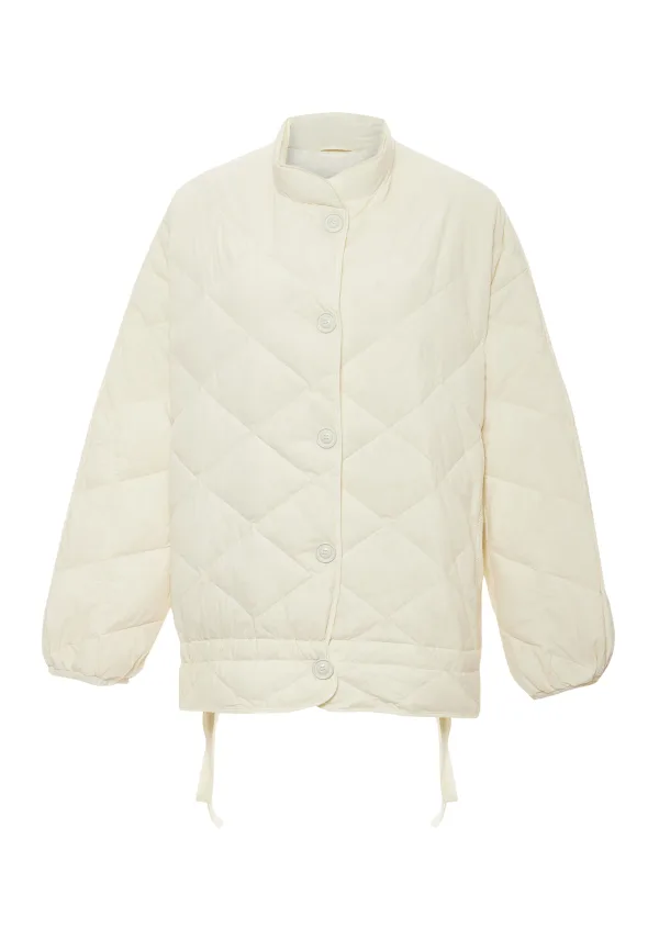 Dit gewatteerde jack is ontworpen voor koelere weersomstandigheden en heeft een hoge kraag en een knoopsluiting aan de voorkant. Het diamantquilt zorgt voor zowel warmte als stijl, terwijl de verstelbare zoom en pofmouwen voor wat structuur zorgen. Deze jas is afgewerkt met eenvoudige manchetten en biedt een casual maar comfortabele look die perfect is voor dagelijks gebruik.