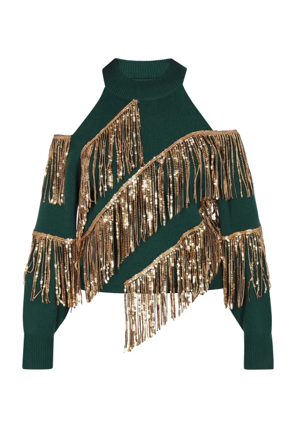 Maak kennis met een damestrui die verfijning en glamour uitstraalt. Dit kledingstuk heeft een hoge kraag, lange mouwen en asymmetrische franjes die elegant over de borst en armen vallen. De glanzende metalen franjes voegen een vleugje weelde toe aan het klassieke gebreide ontwerp. Jumper
